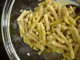 – 1 Glas Wachsbrechbohnen in etwas Salzwasser kochen und mit einem Dressing aus Olivenöl, Essig, Salz, Pfeffer, Zucker und Sojasahne vermischen.